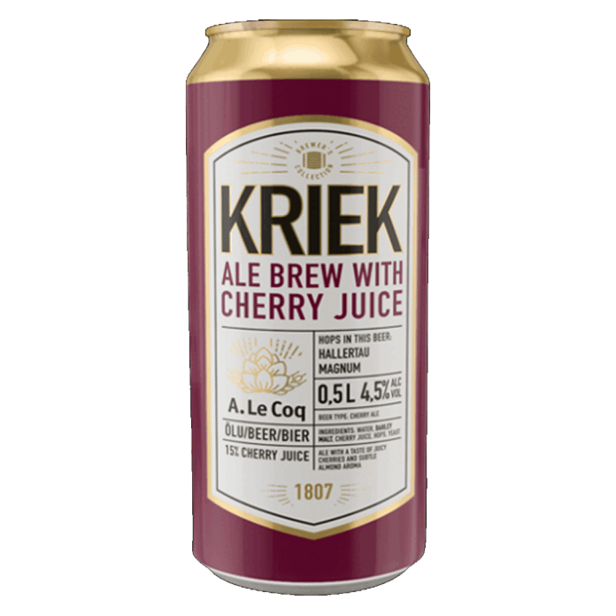 A. Le Coq Kriek is an ale that contains 15% of real cherry juice. In the brewing process we have used Hallertau Magnum hops and this beer has a nice sour cherry taste and a slight aroma of almonds.